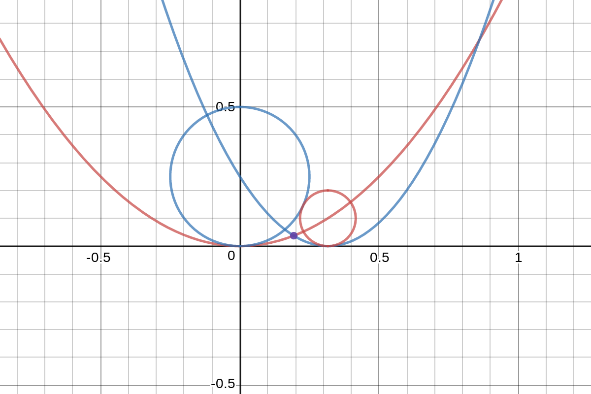 Do you notice a pattern drawn by the centers of the tangential circles? They follow a quadratic curve (parabola) away from the fixed circle. After a little poking around in an algebra book, I quickly realized that given a fixed circle, the centers of the tangential circles all lie on a parabola where the fixed circle sits at the focus! Check out the Desmos link below for a demo.