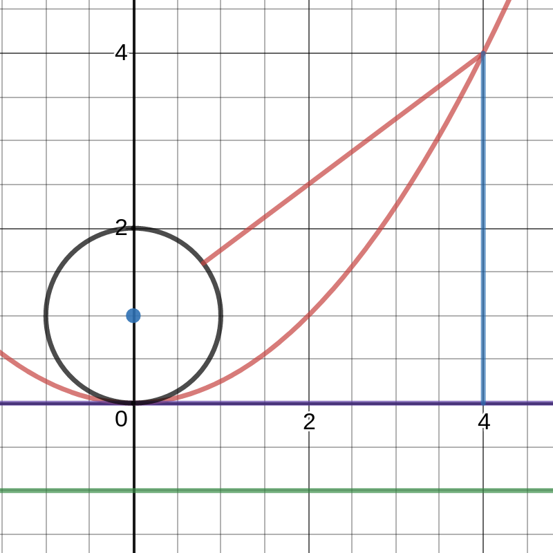 Let's use the previous image as an example. I have identified all of our "fixed points" (the black circle around the focus and the purple line along the x-axis) that are the focal distance from either the focus or the directrix. If we consider the point (4, 4), it's "shortest line" to the directrix is straight down and interesecting the directrix at a perpedicular angle. It is also a distance of 4 from the purple line through the vertex (and a distance of 5 to the directrix). What about the "shortest line" between the focus (0, 1) and (4, 4)? Well, the horizontal distance is 4, and the vertical distance is 3. This makes a 3-4-5 triangle, so it is 5 units away from the focus. That means it is also only 4 units from the circle around the focus. This means we can sweep a line of length 4 around the point (4, 4) and get a circle that intersects both the circle around the focus and the line through the vertex. Cool, right?!